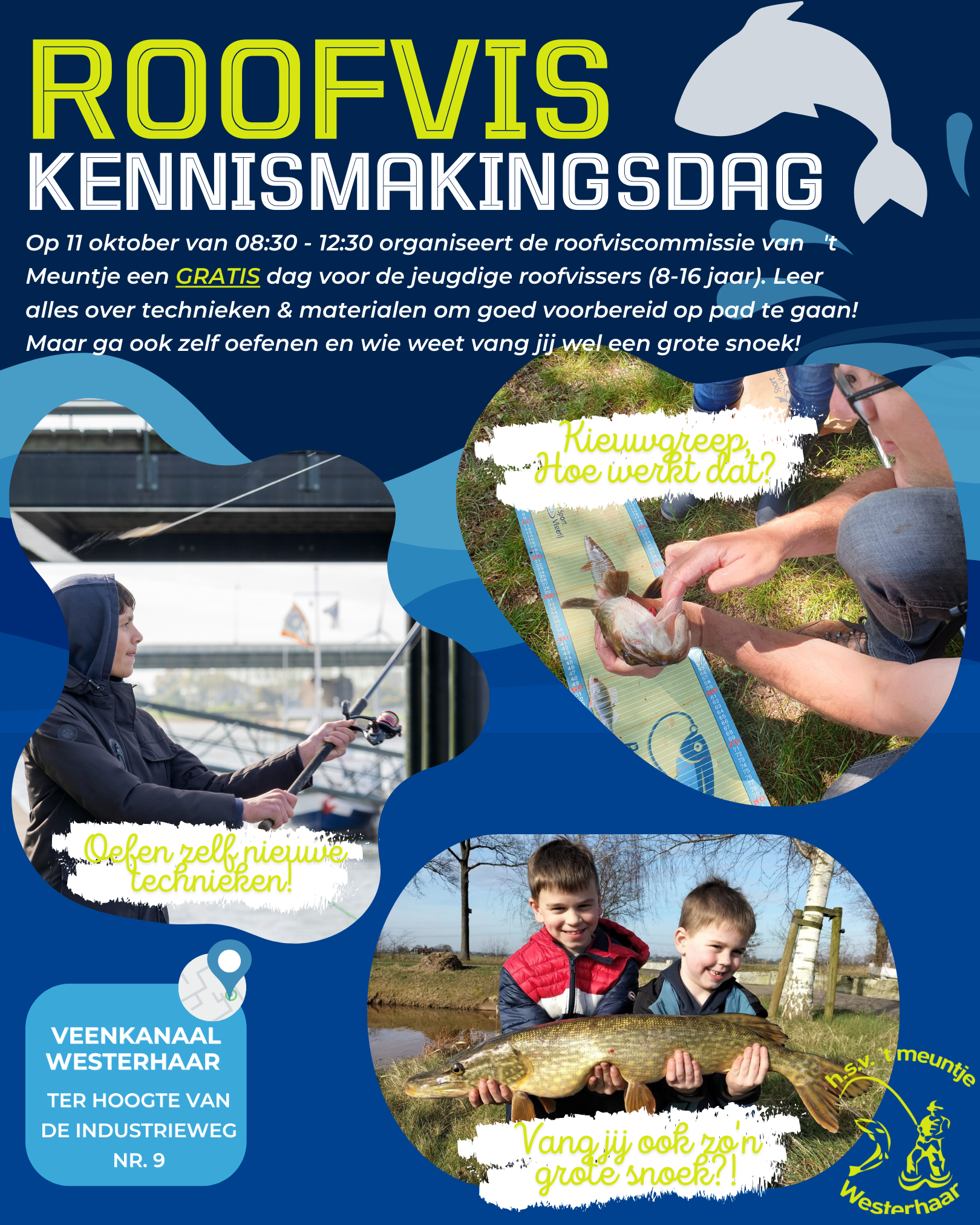 De roofviscommissie van HSV 't Meuntje organiseert op 11 oktober een roofvis kennismakingsdag. Deze dag wordt speciaal georganiseerd voor de jeugd en is geheel kosteloos! Maak kennis met verschillende technieken en stijlen van het roofvissen maar leer ook waar je rekening mee moet houden!